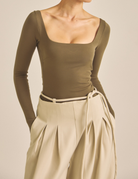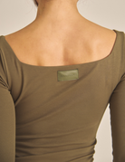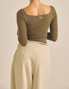 袖と着丈は少し長めに設計され、デコルテを美しく見せるスクエアネックが上品さを演出。盛りすぎず、ナチュラルに、でもしっかりと女性らしさを引き出してくれる一枚です。