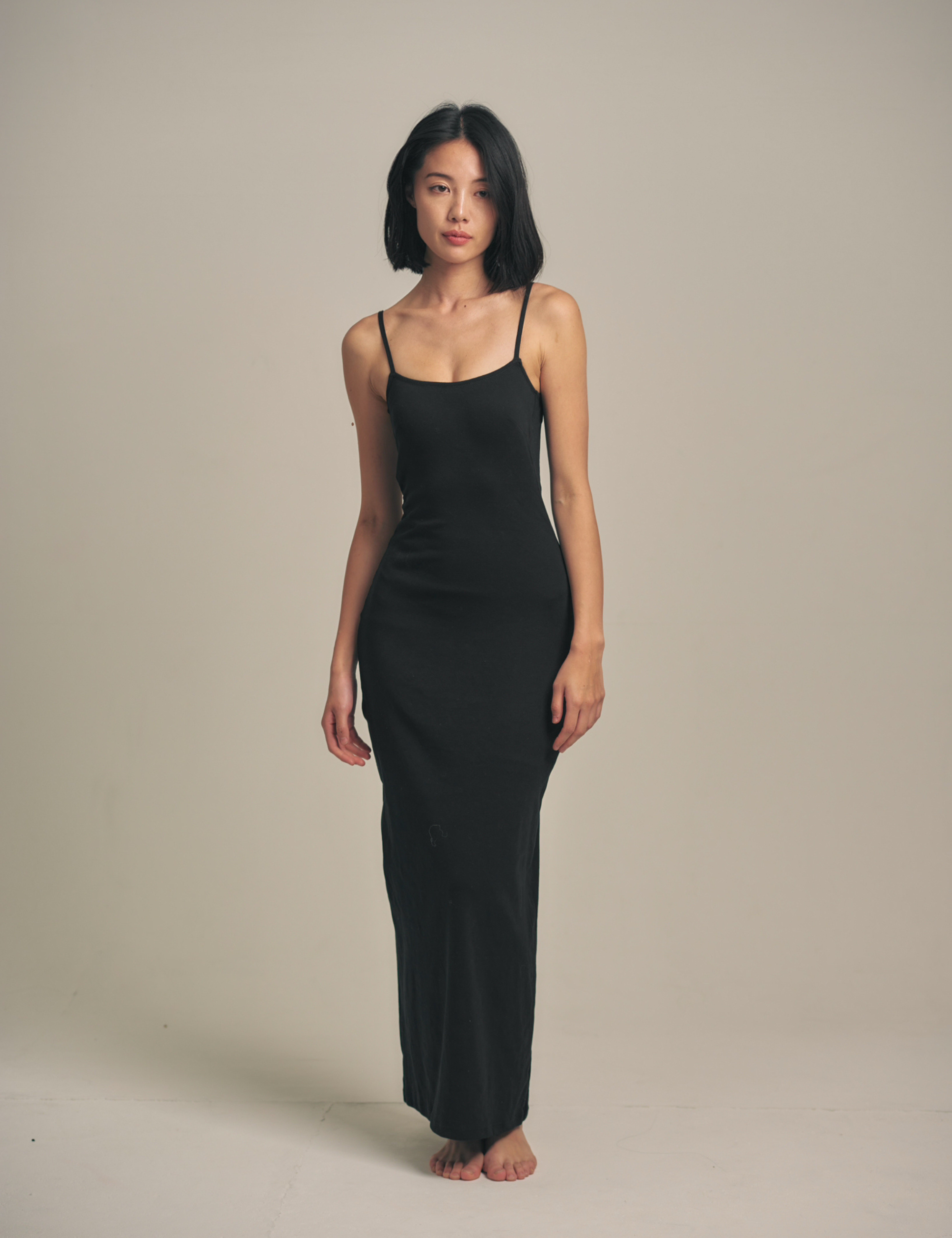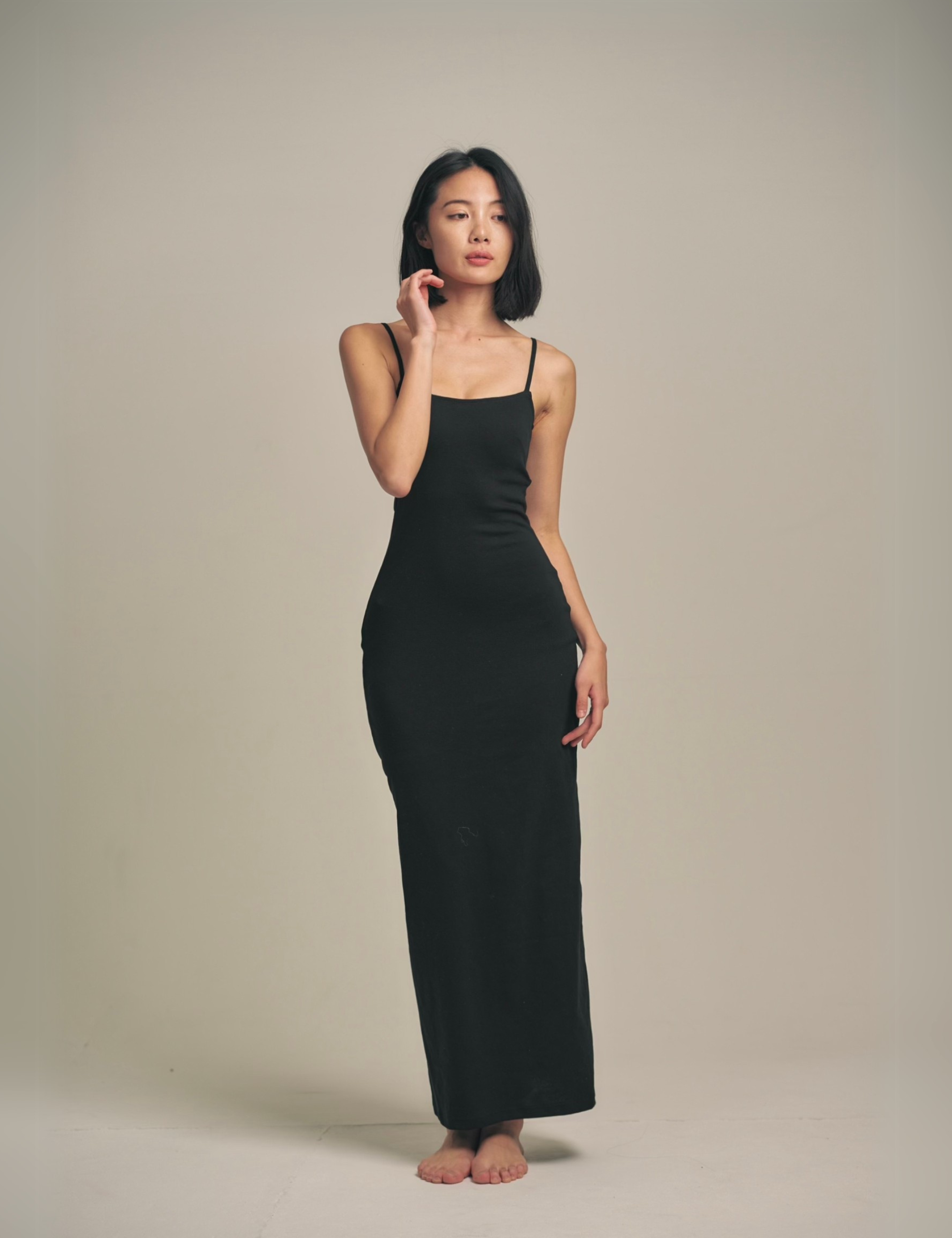 キャミソールタイプで肩紐の長さは自在に調整可能。マキシ丈が縦のラインを強調し、エレガントな印象に導きます。