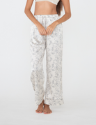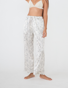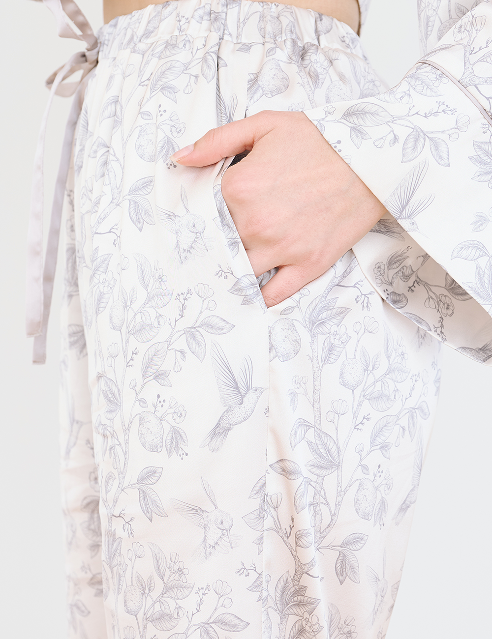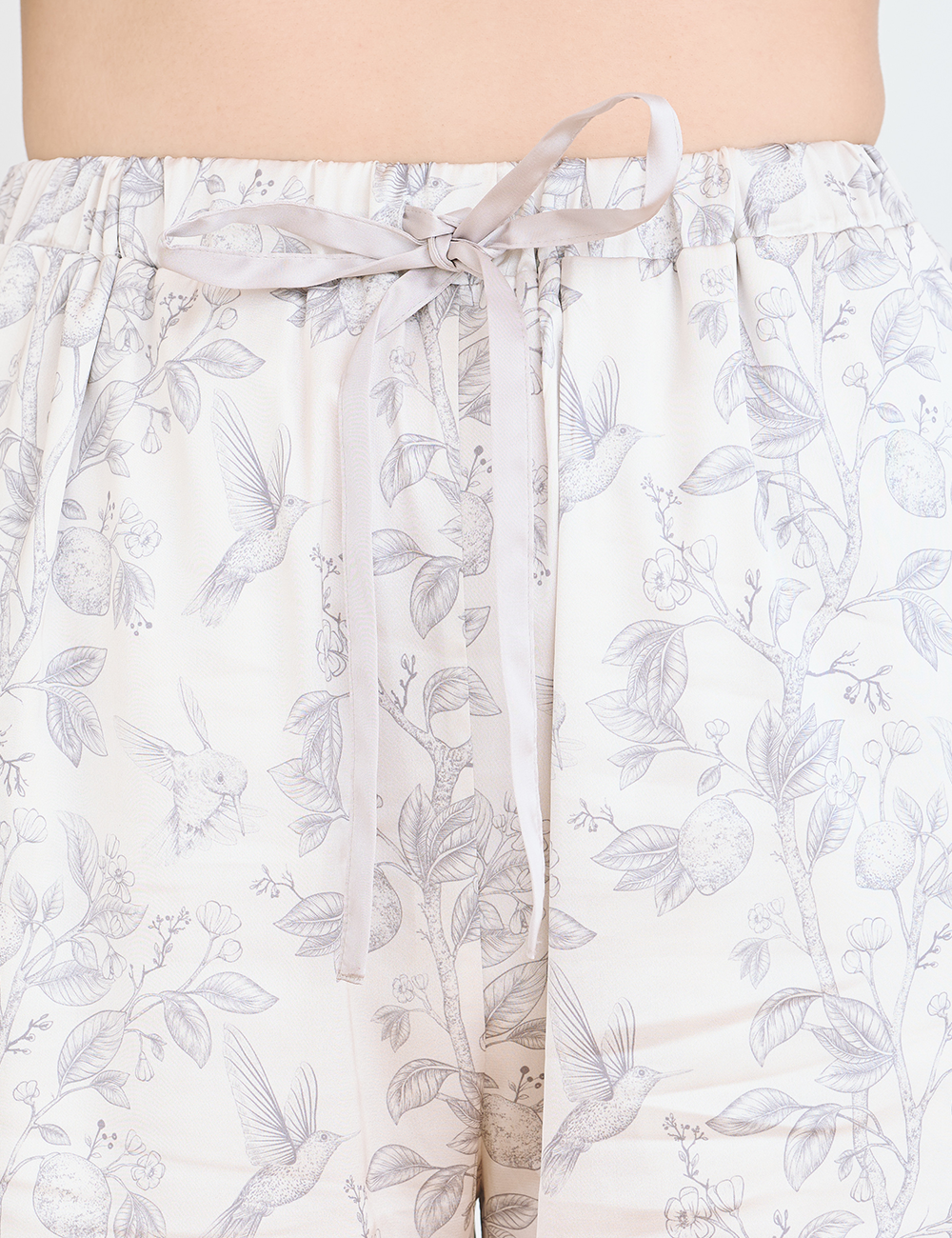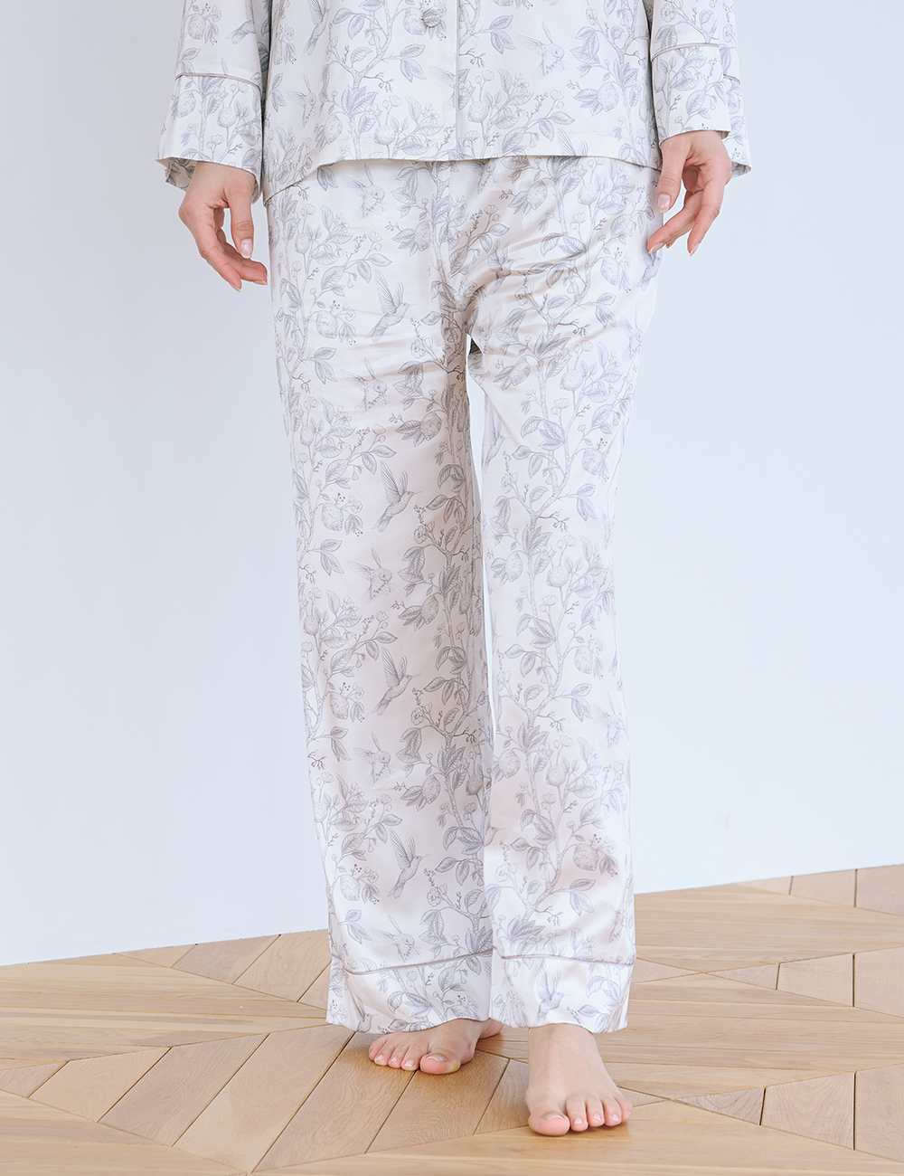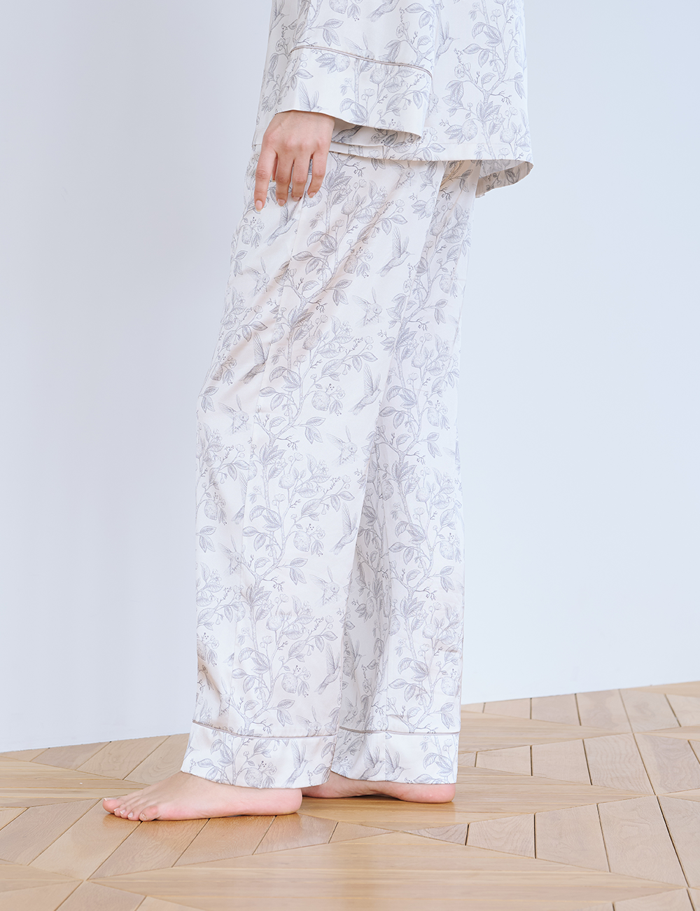 快適さとエレガントさを兼ね備えたサテンパンツ。ウエストはゴム仕様で、ゆったりとしたシルエットがリラックスした着心地を提供。寝返りを打つたびにストレスフリーで、まるで羽のように軽やかな着用感が広がります。
