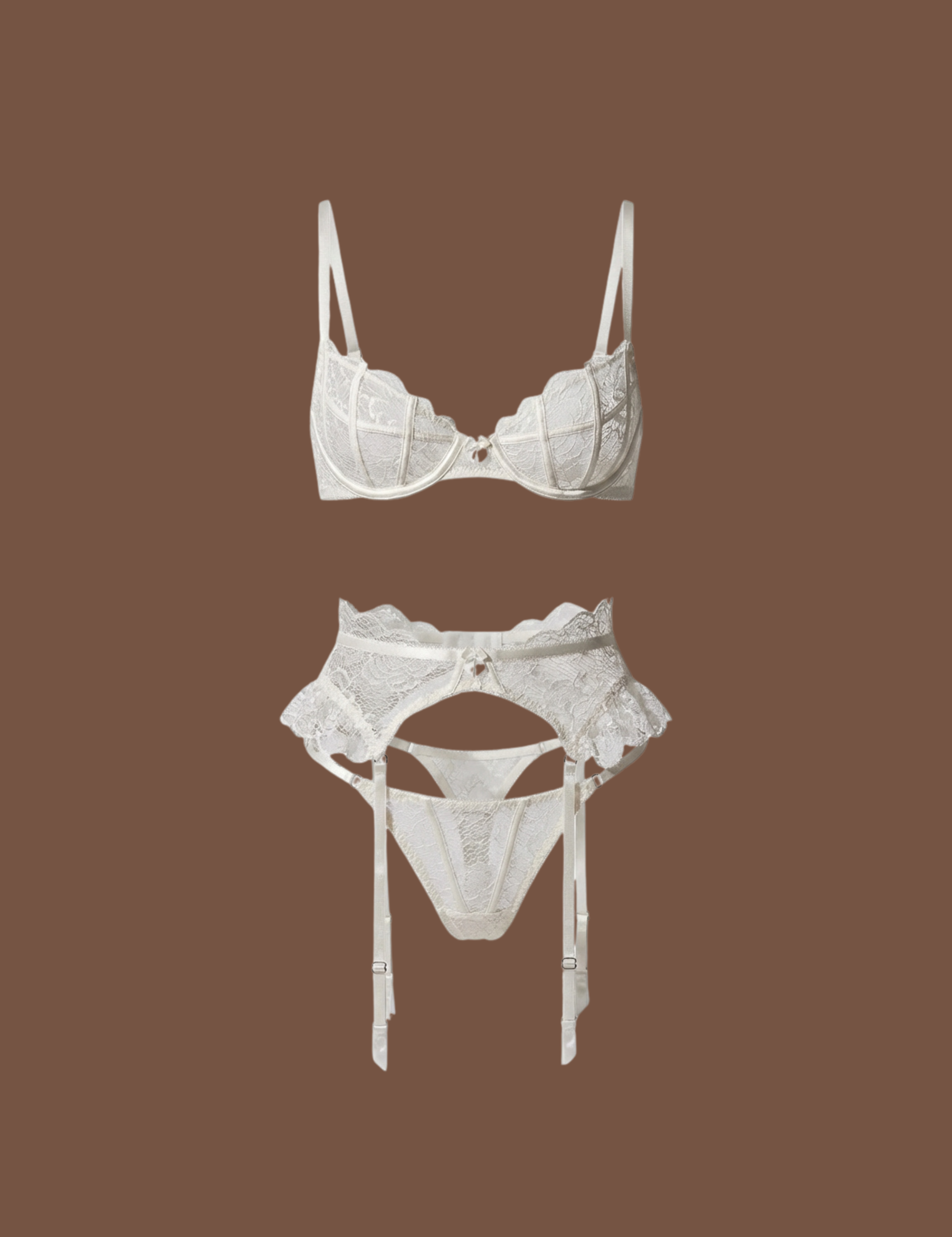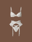 ブラレットはバストラインを美しく引き立て、ショーツは身体にしなやかに沿い、ガーターベルトはコーディネートに華やかさを添えます。