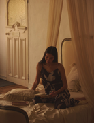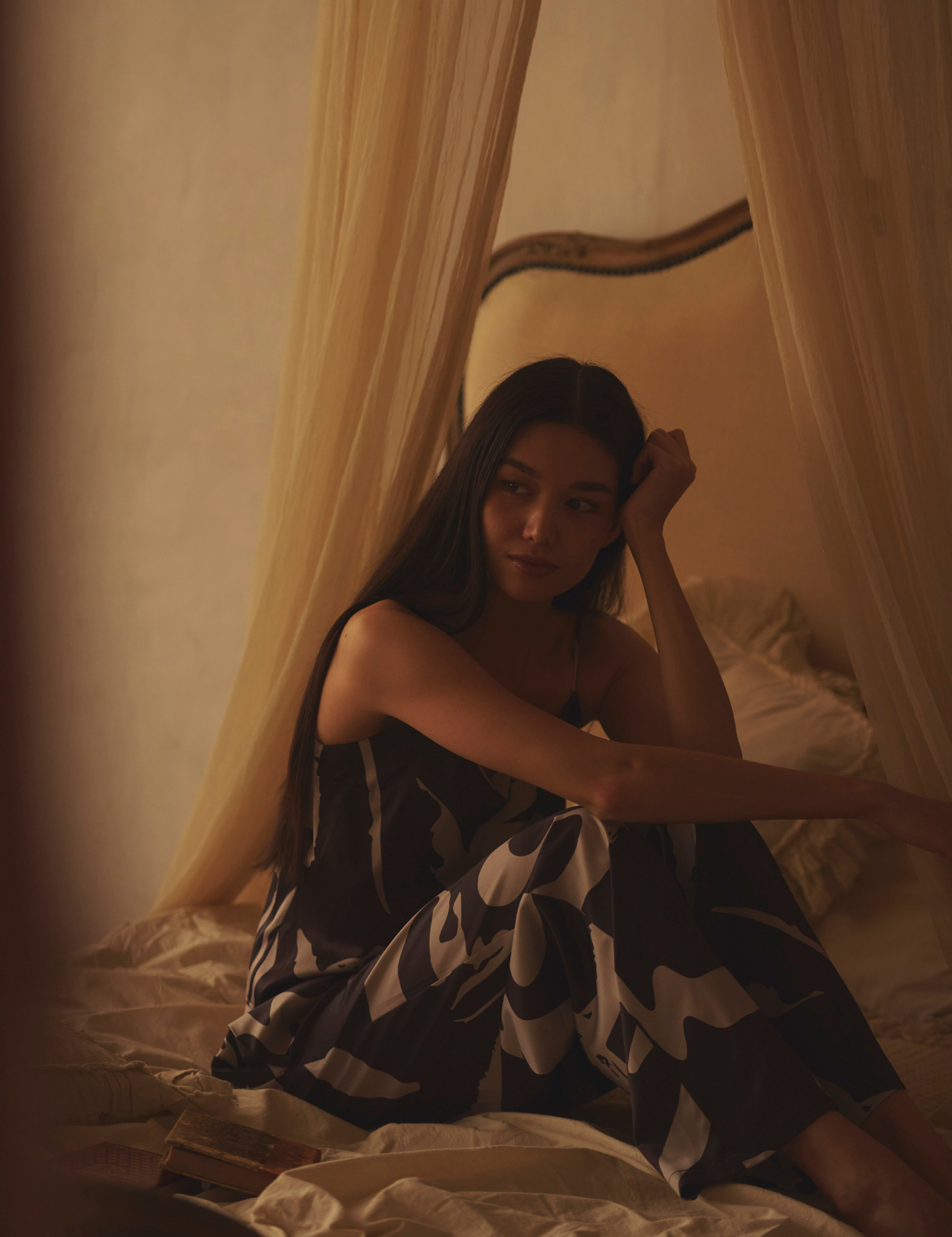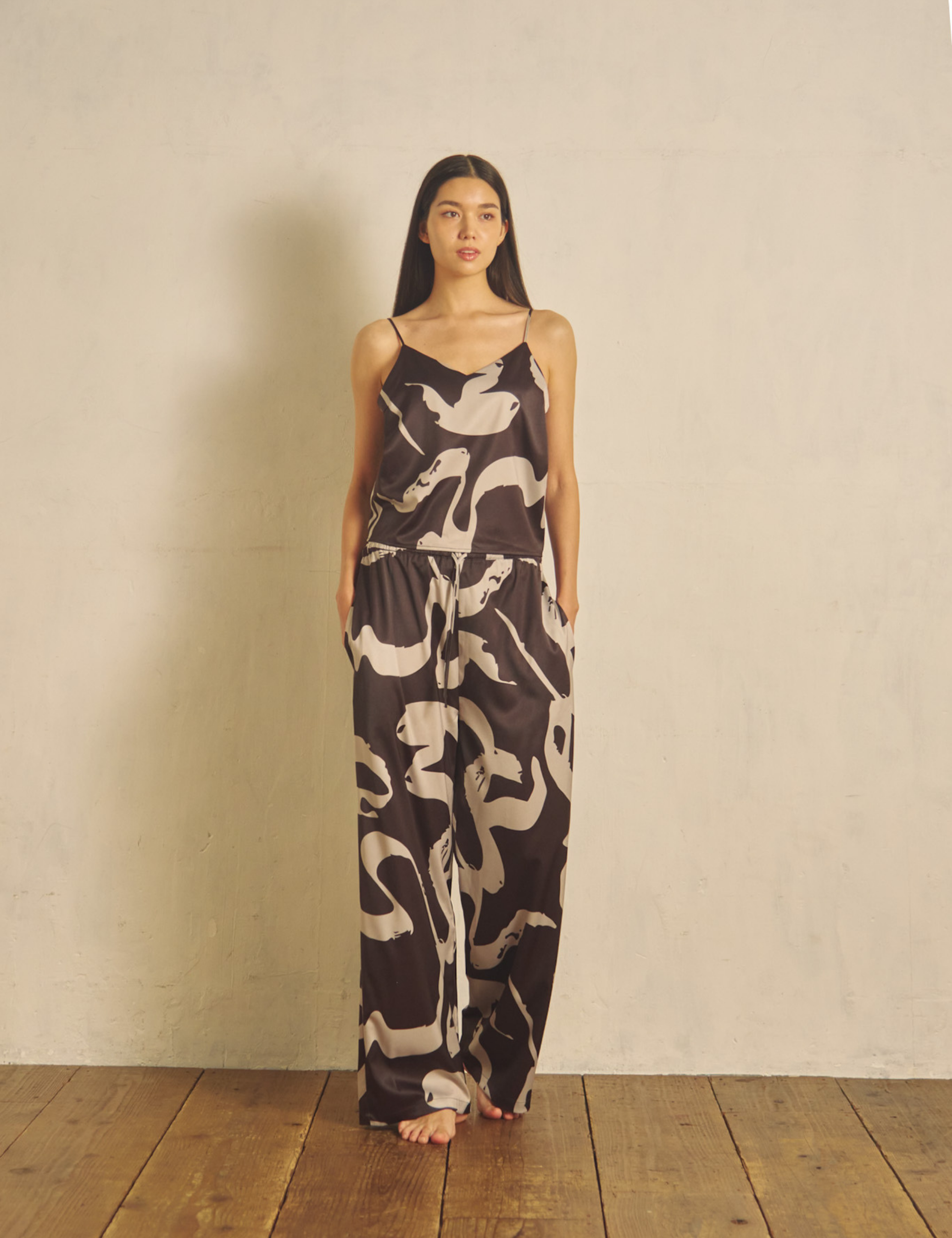 同柄のサテンスカート/パンツとセットアップで着用すれば洗礼されたラウンジウェアスタイルに。