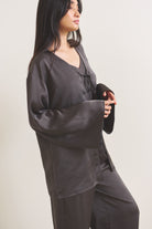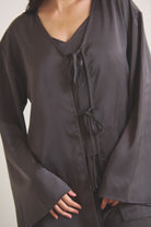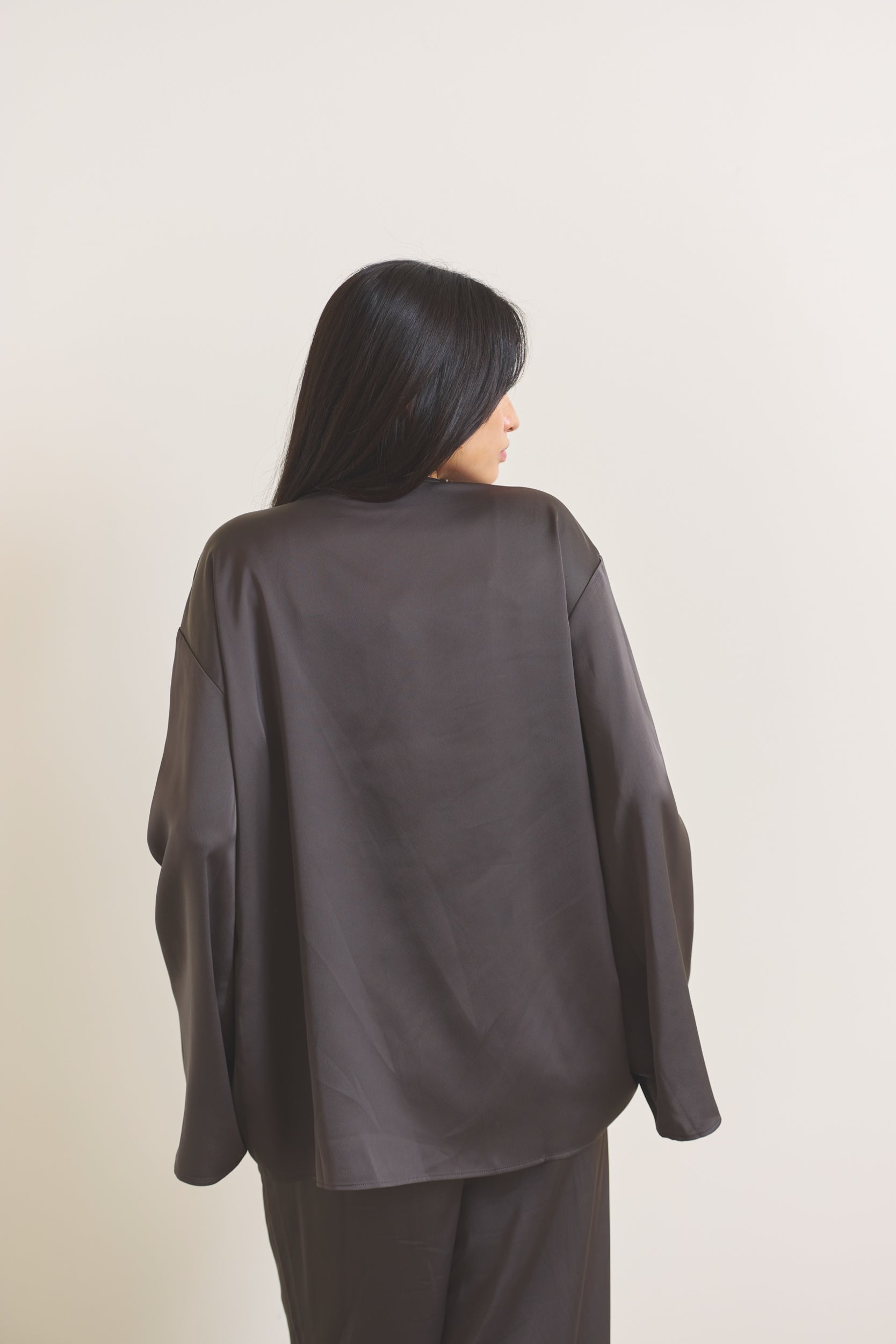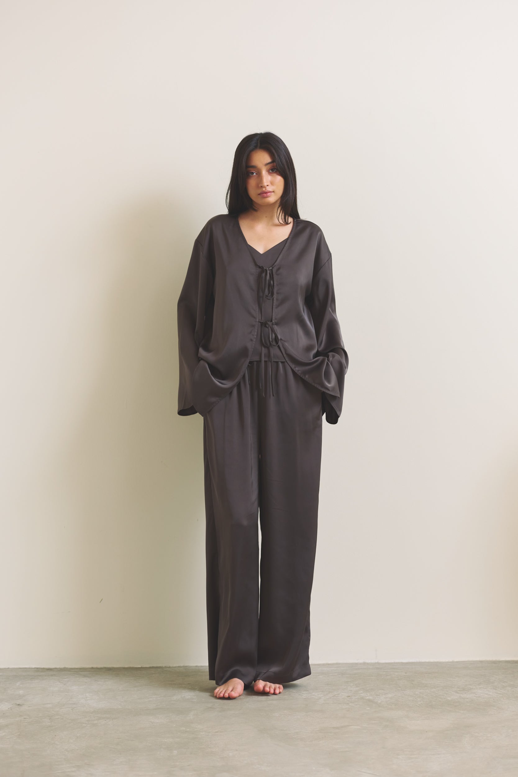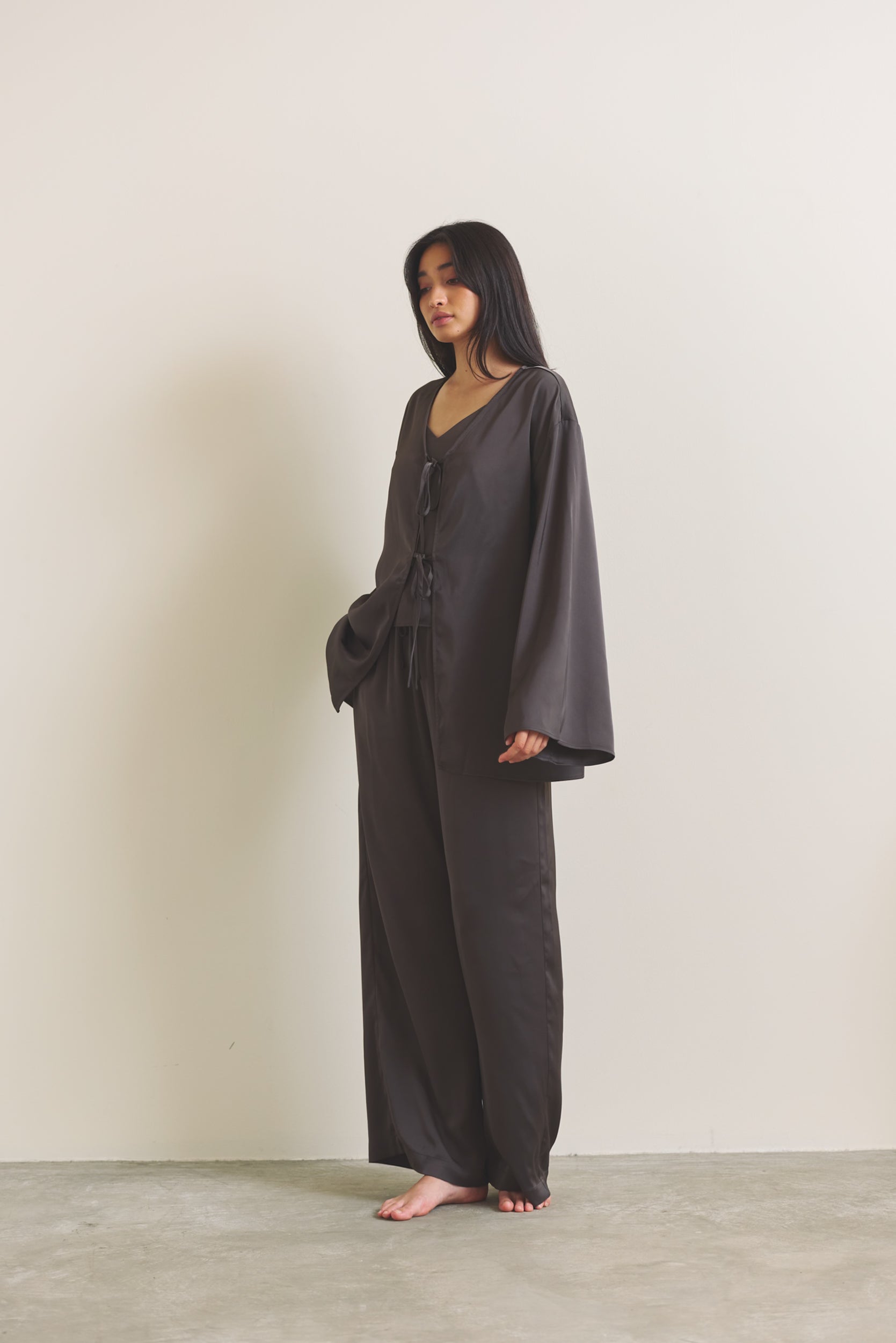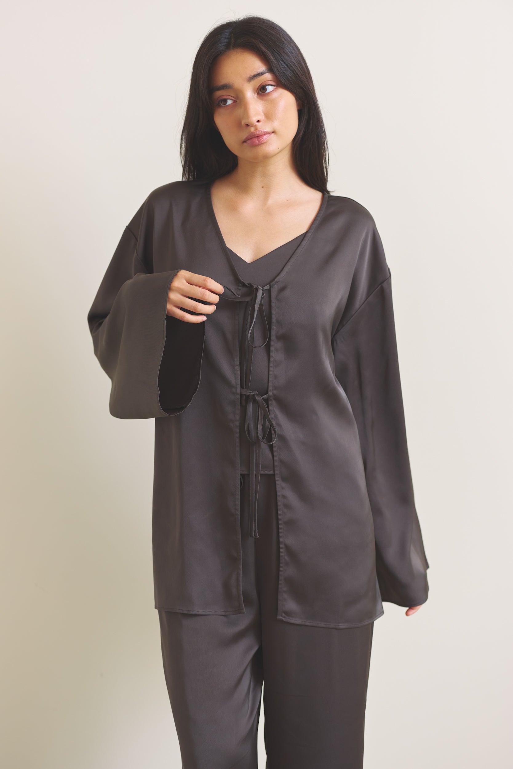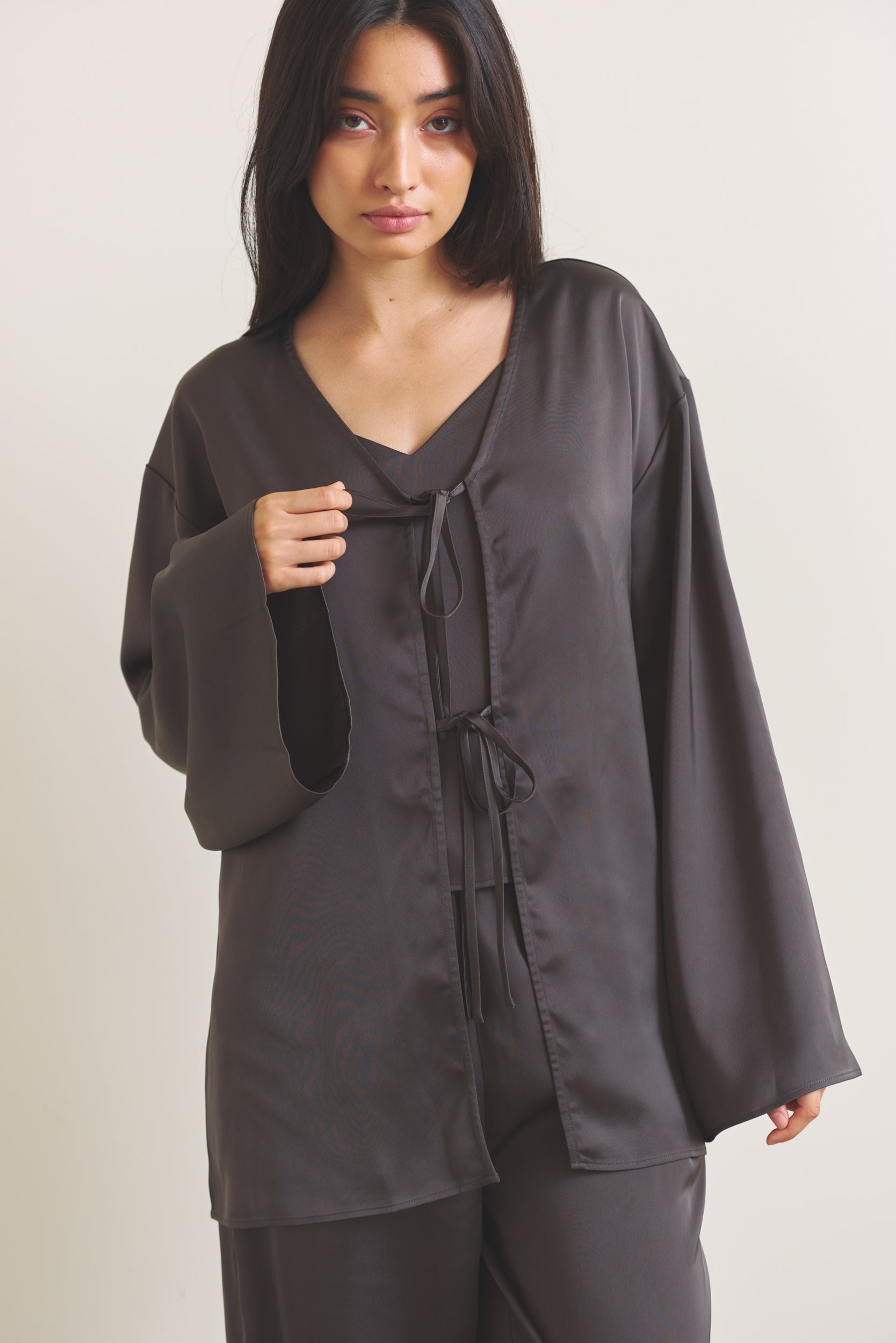 柔らかな光沢が映える、軽やかなサテン羽織。