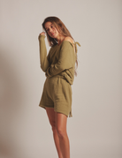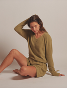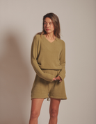 ネックはVラインで鎖骨が美しく見える上品なカッティング。パンツの丈感にもこだわり、足が一番綺麗に見えるバランスを追求しました。短すぎず、長すぎず、絶妙な抜け感を演出します。