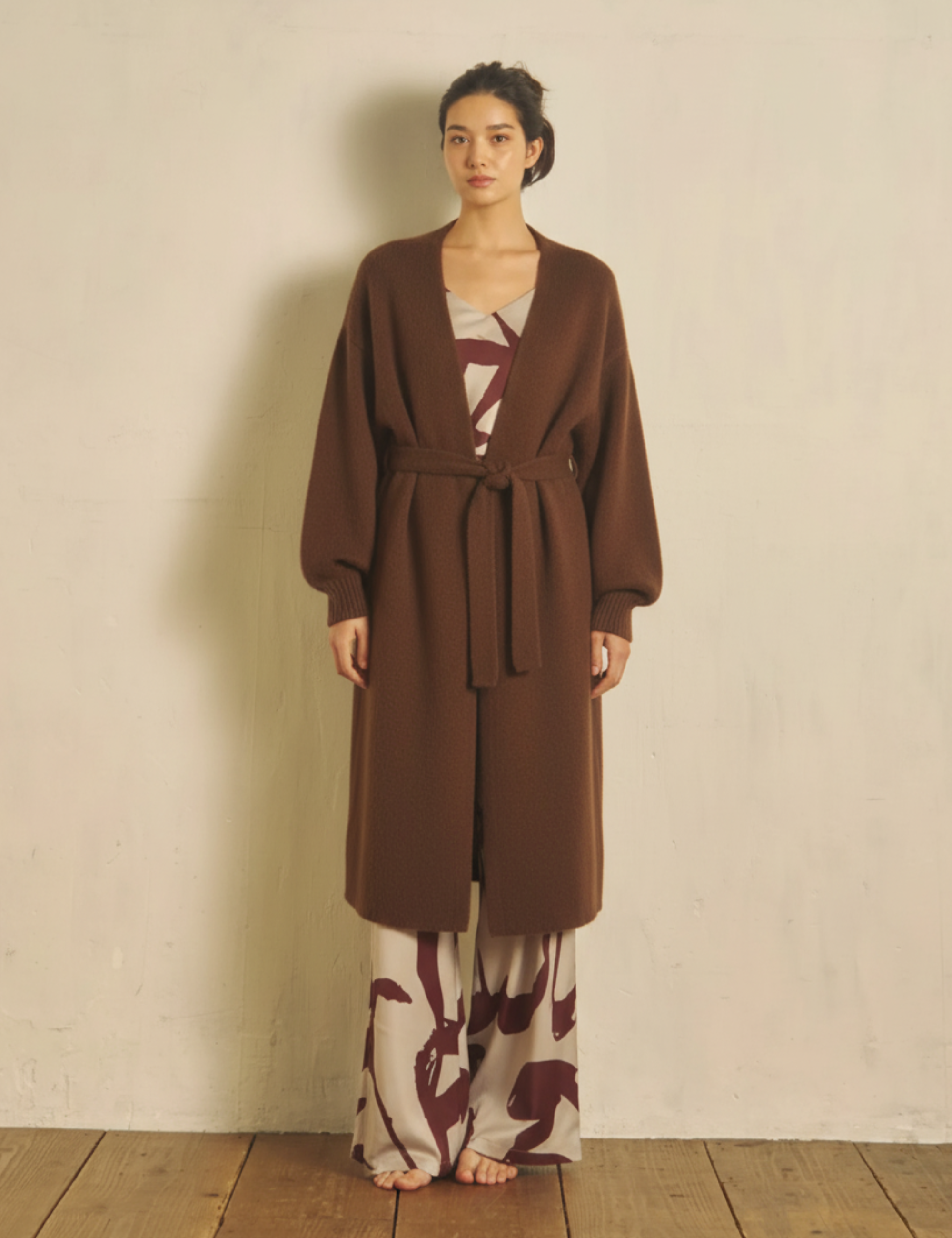 首まわりから裾へ流れるラインが美しく、ルームウェアとしてはもちろん、日常の羽織りにも活躍する一着です。