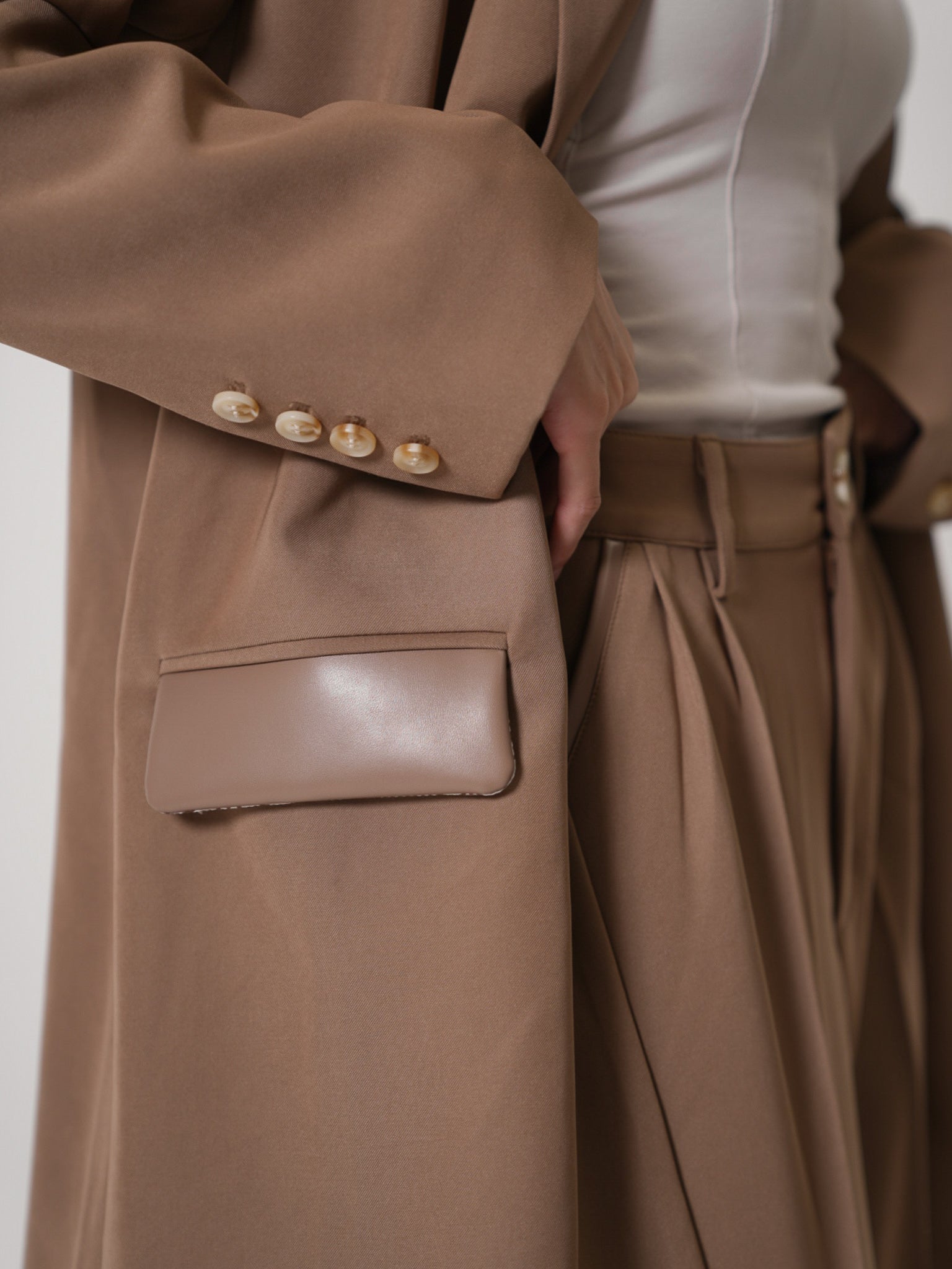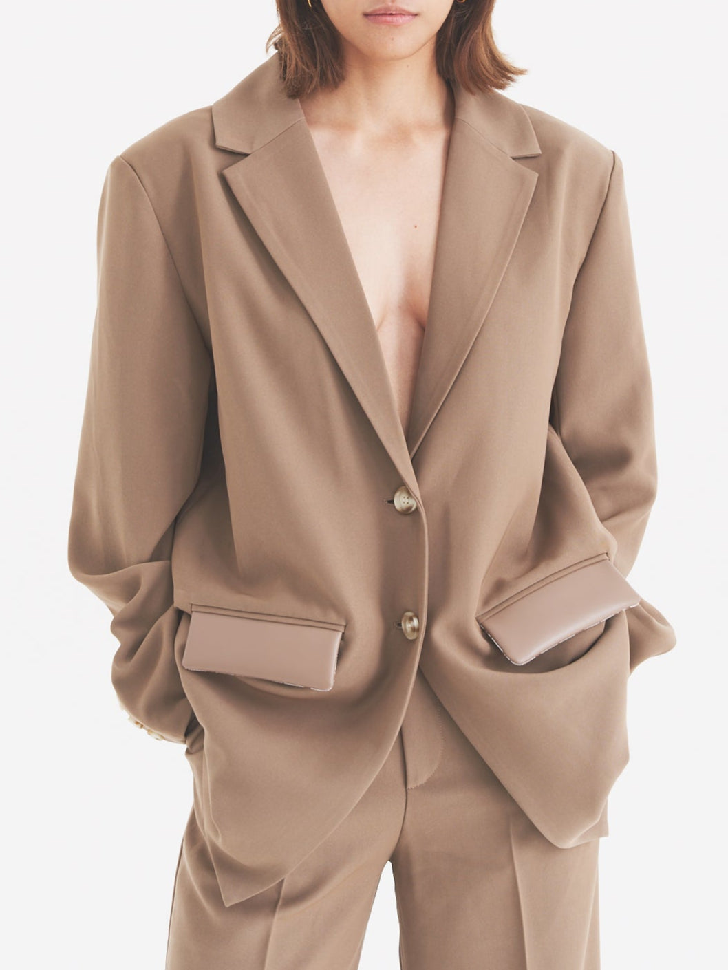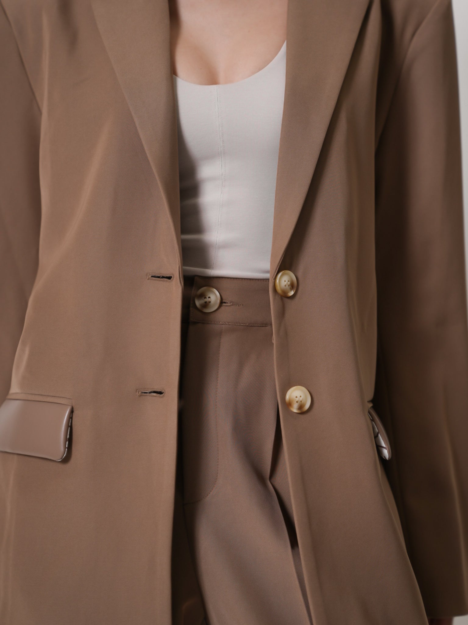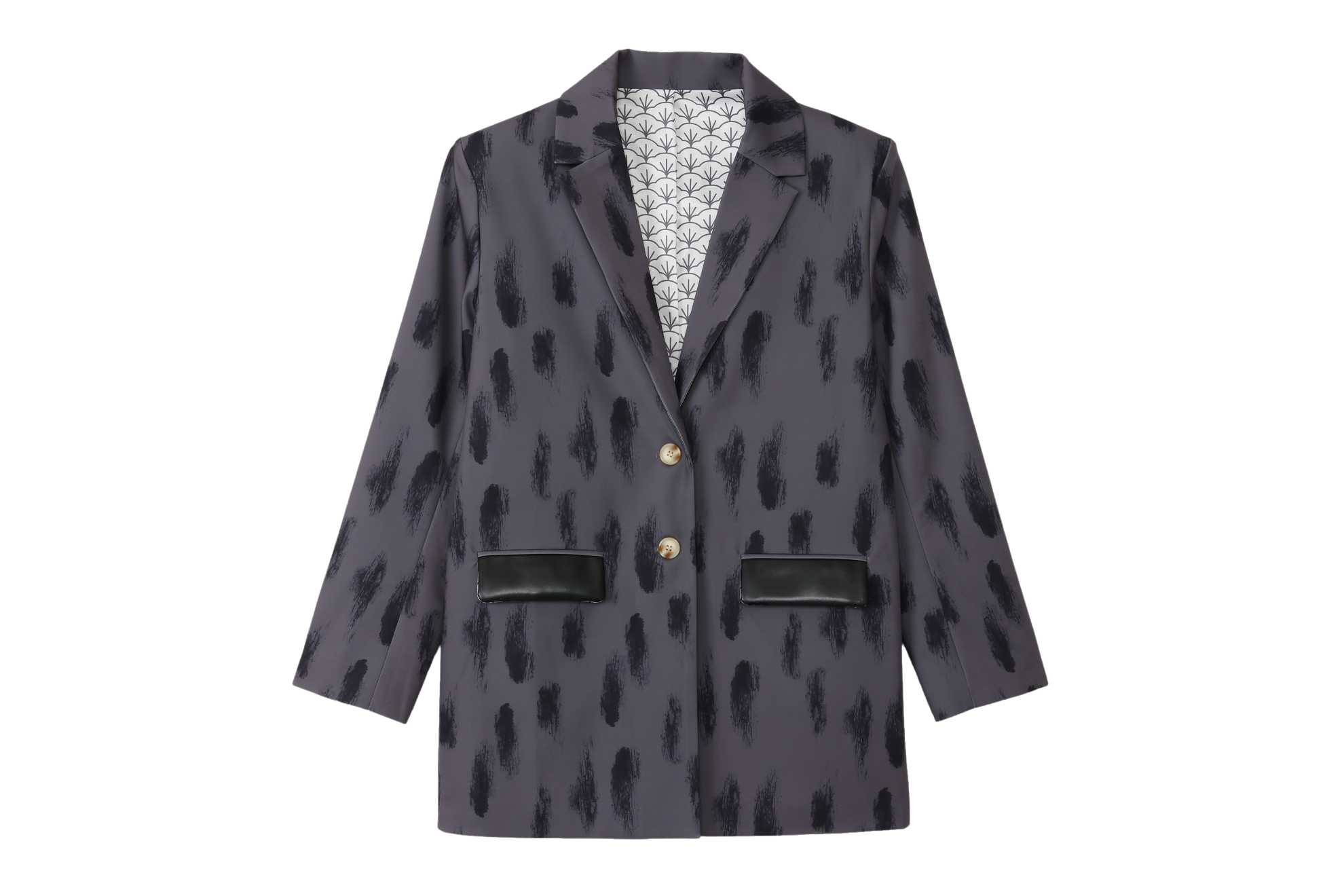Our luxe padded blazer jacket features a classic collared neckline with an oversized fit, faux leather pockets, and a satin lining with a Japanese pine pattern. This blazer jacket is perfect for elevating any outfit on any occasion! Wear it as an oversized jacket dress or pair it with our matching luxe straight pants to complete the look.