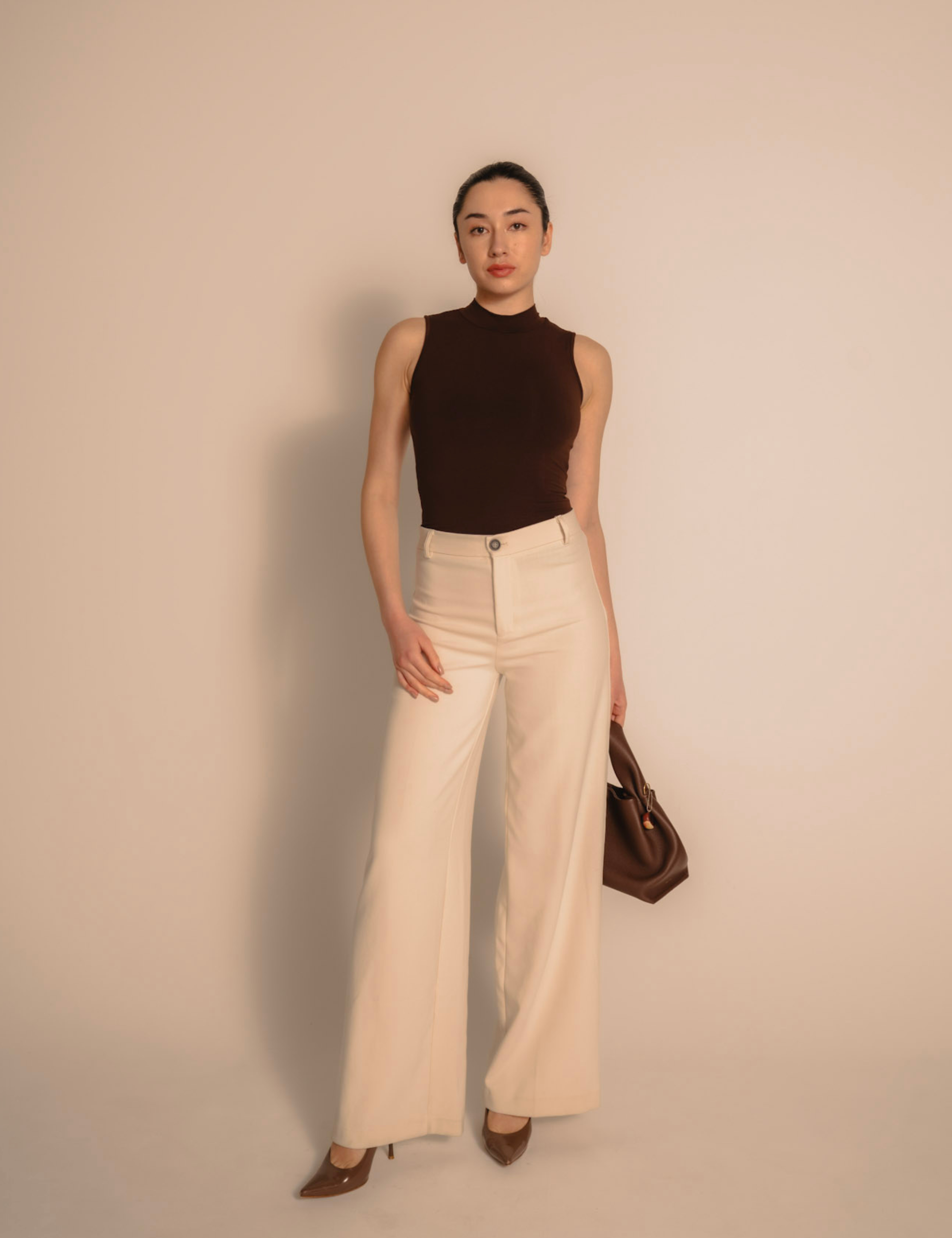 タートルネックデザインのタンクトップ。首元を優しく包み込み、上品な印象を演出。程よくフィットするシルエットで、身体のラインを美しく見せるデザイン。パッド入りで入れ替え可能。Aのロゴをさりげなく全面裾部分に配置。