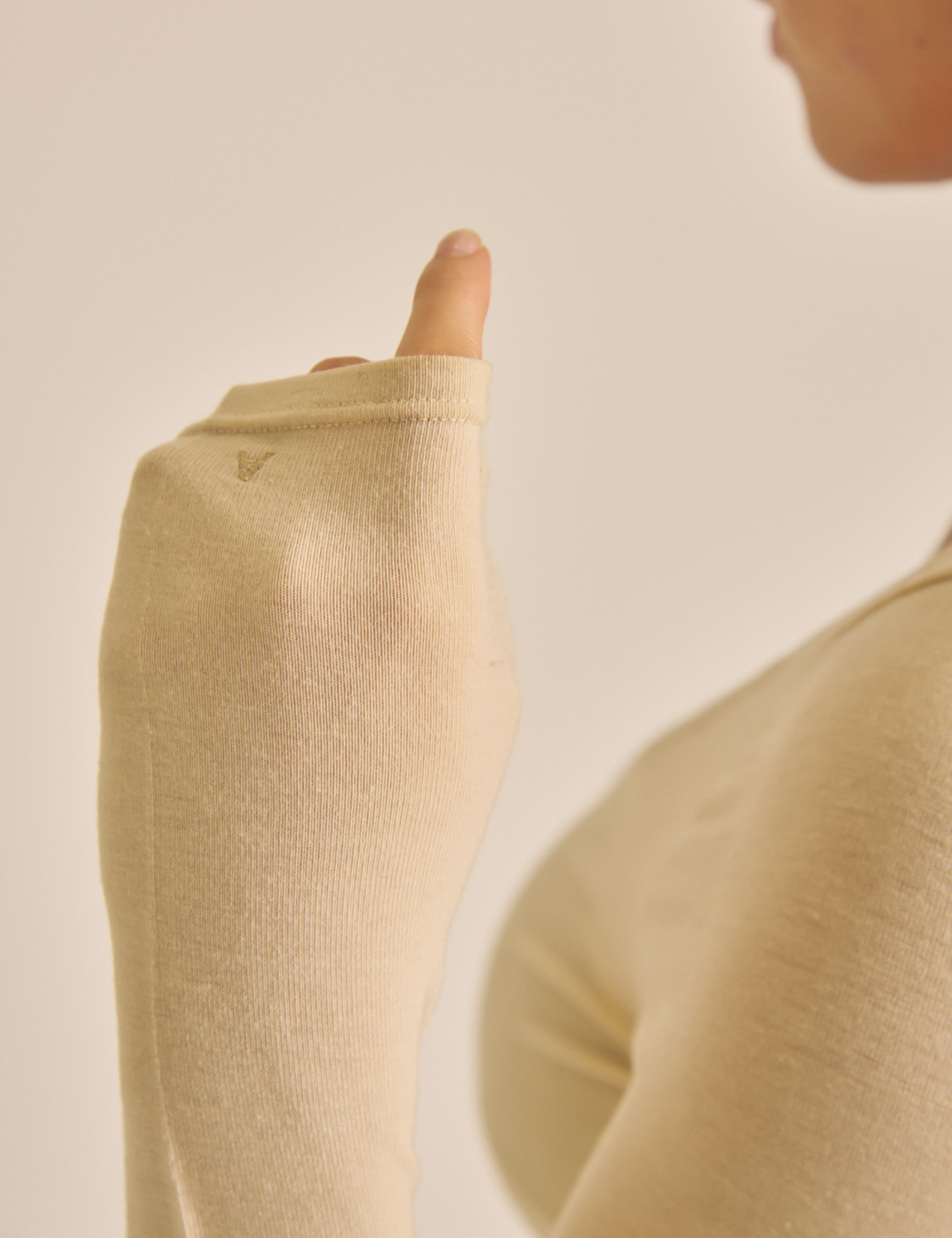 同シリーズのブラトップやレギンスと合わせれば、素材のコントラストを活かした洗練されたレイヤードスタイルに。