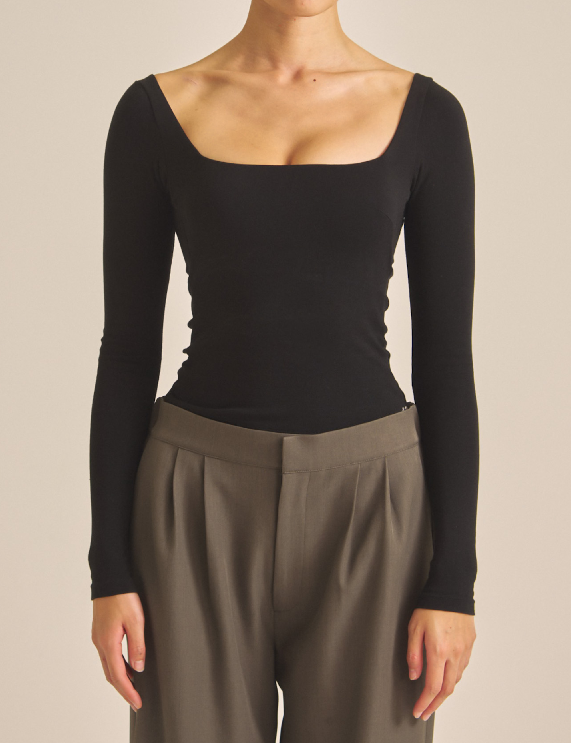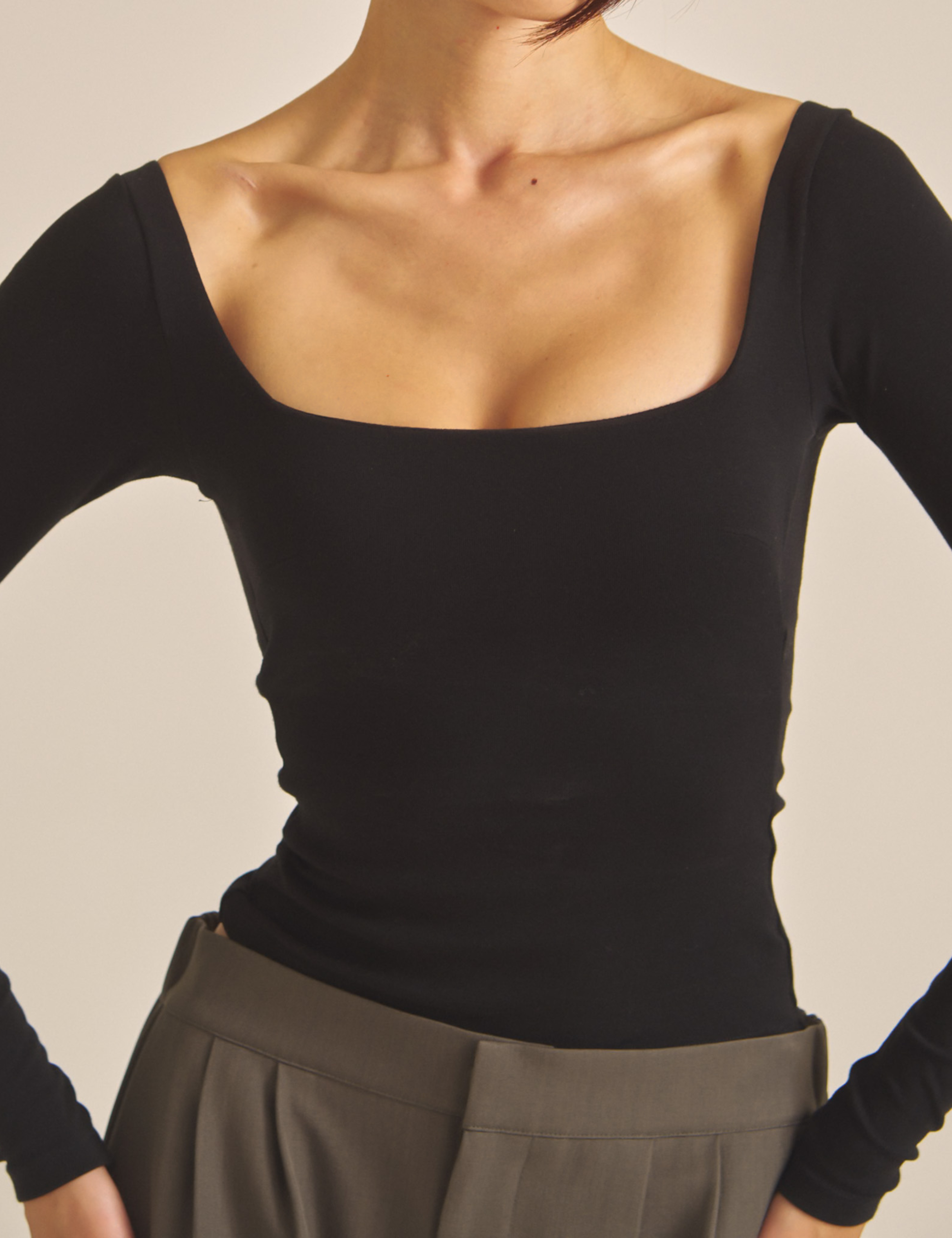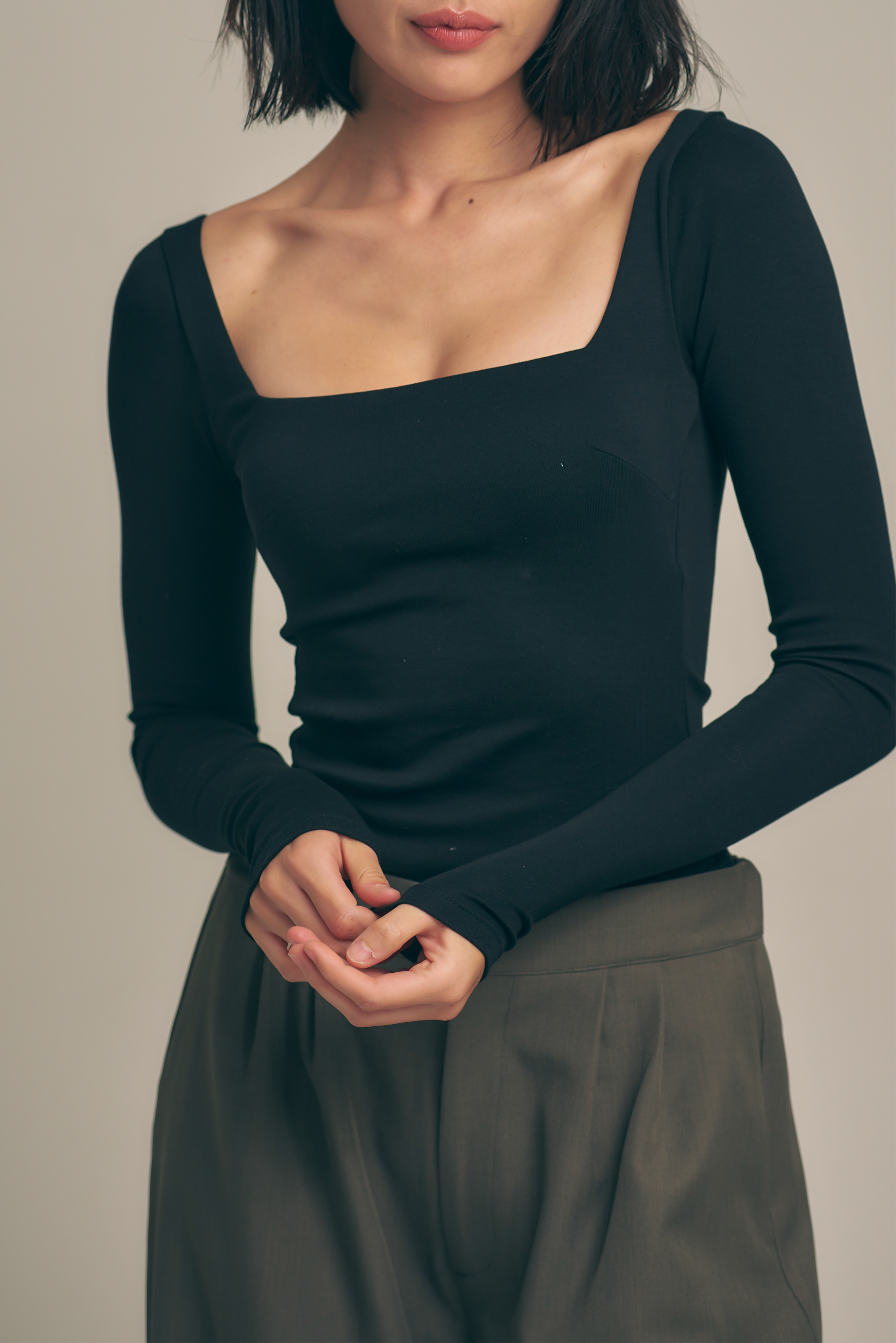 袖と着丈は少し長めに設計され、デコルテを美しく見せるスクエアネックが上品さを演出。盛りすぎず、ナチュラルに、でもしっかりと女性らしさを引き出してくれる一枚です。