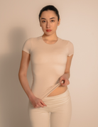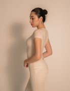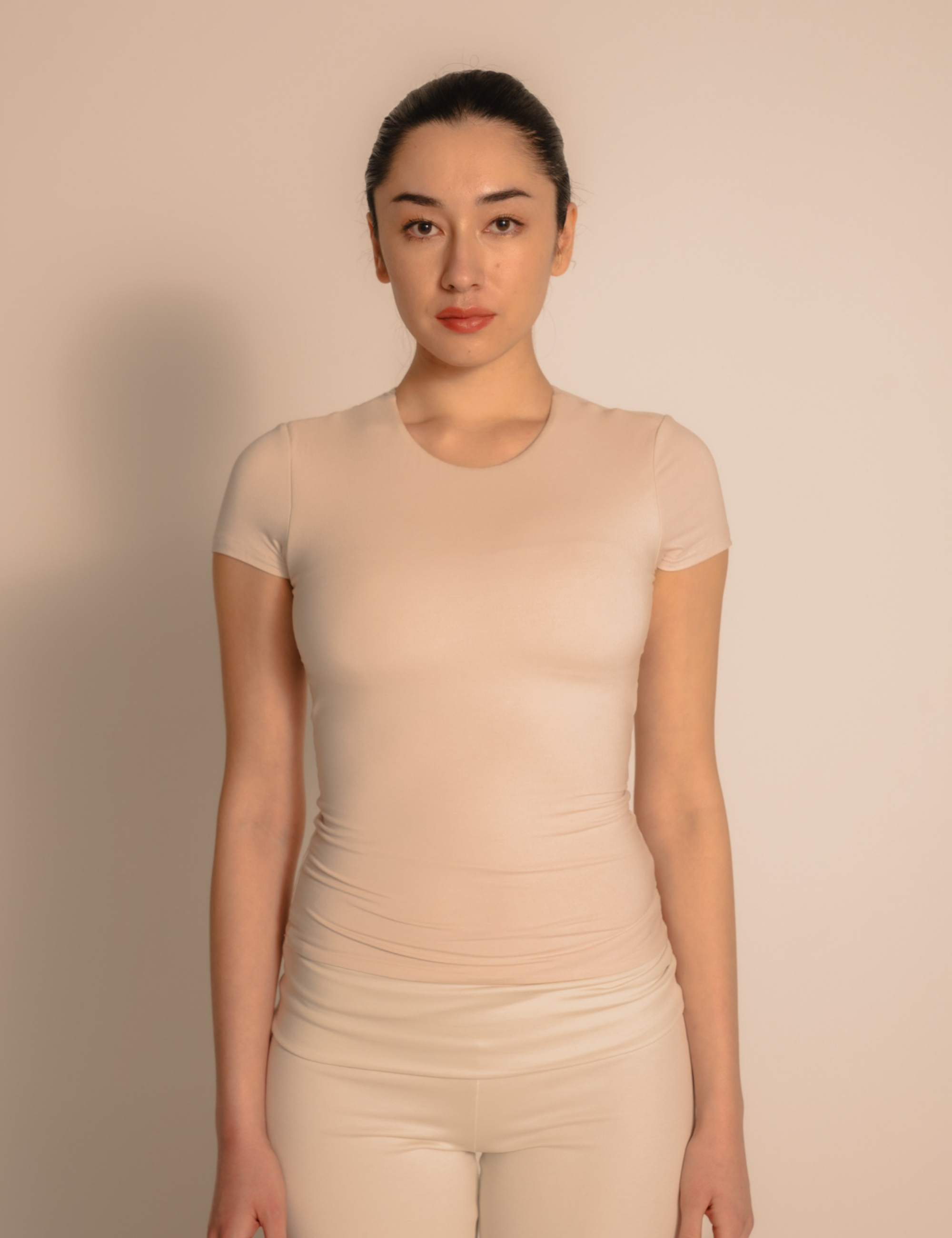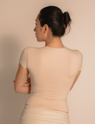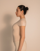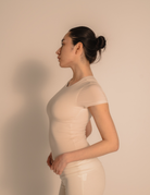ミニマルなデザインながら、美しいシルエットを叶えるパッド入りTシャツ。しっかりとしたカバー力がありながら、通気性に優れた生地で春夏でも快適に着用可能。肩からウエストにかけて流れるようなラインを作り、すっきりとした印象に。シンプルながらもエレガントな仕上がり。