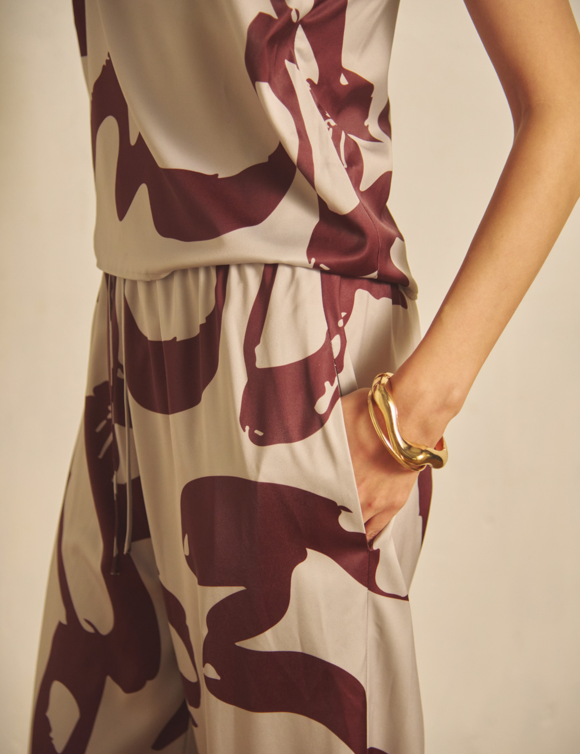 ほどよい落ち感と上品な光沢をまとった、シルキーサテンのパンツ。