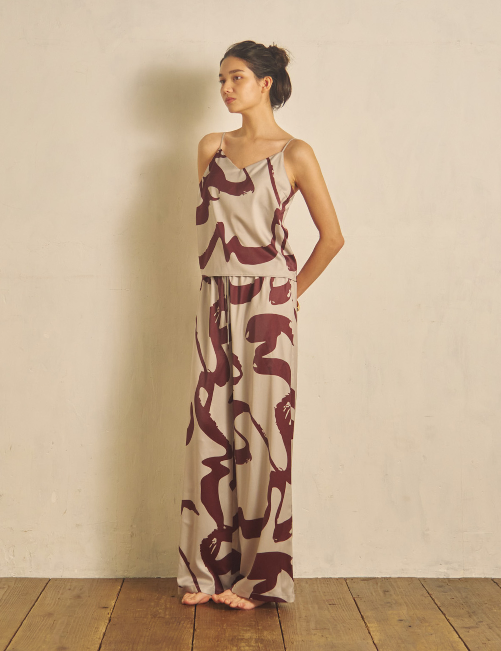 同シリーズのキャミソールと合わせたセットアップでラウンジウェアに。